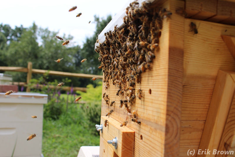 Foragers coming and going from our top bar hive Venus, with other bees bearding by the front entrances. You can see our Langstroth hive Jupiter in the background.