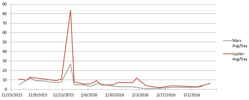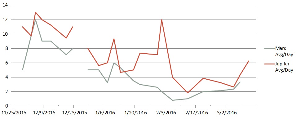 Unfortunately I never took a picture of the winter boards, though I did track the numbers. The below graph shows the average daily mite drop from Mars and Jupiter From November 25 to March 12. Mars had three boxes (one deep, two mediums), while Jupiter two (one deep, one medium).