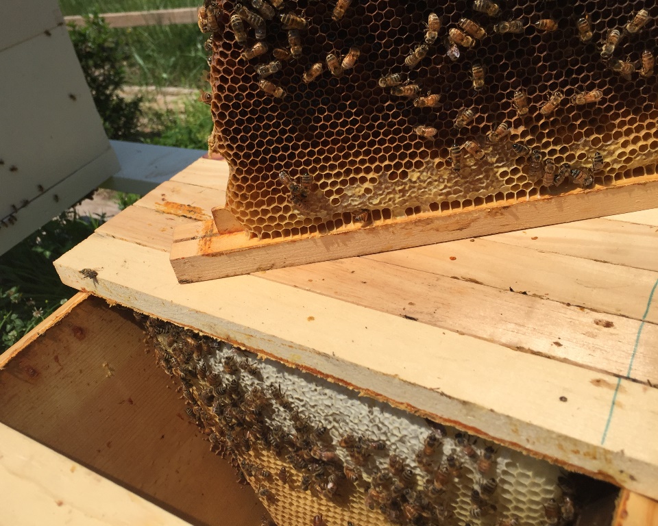 My plan was for Mars to produce honey this year, and it was booming in April and I had built it up to five boxes: one deep and four mediums. After measuring a high mite count on April 24, I treated the hive with a single MAQS strip. With a single strip, essentially a half-dose, I figured the queen would be fine. Well, I’m not sure she was. Since this treatment I hadn’t found any brood. Perhaps I shouldn’t have treated, as the bees were building up and would likely outpace the mites this time of year.