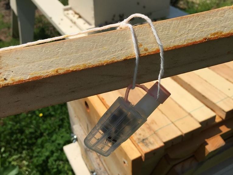 The new queen. I tied her to a top bar as shown here, and inserted her between the third and fifth comb.