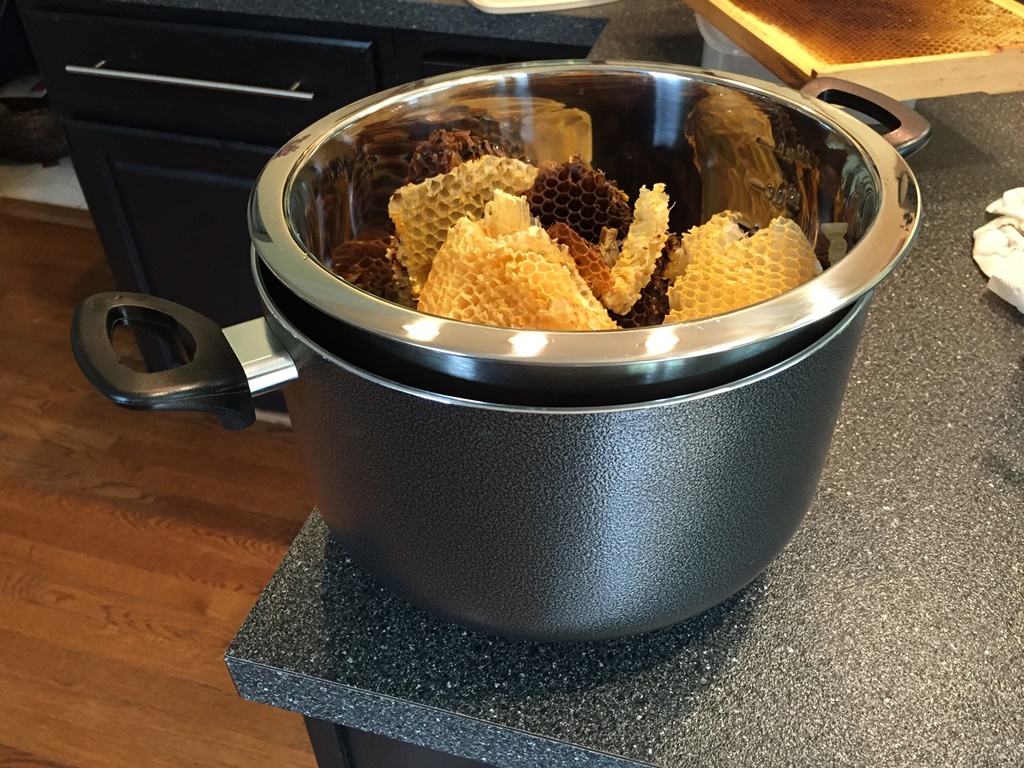 2. hi. if you have an old saucepan I recommend just chucking all the wax bits in with some boiling water from your kettle. melts much quicker and a lot of the crud ends up in the water. the wax floats to the top and brood cases underneath. you can then use the double boiler and cheesecloth for second stage.