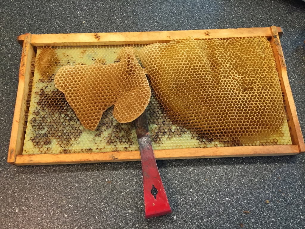 I had a bit more success making some honey. One of my top bars broke. The kerf (a wooden strip) just fell out of the slit in the top bar and the comb dropped to the floor of the hive. A good argument for top bars from a single piece of wood. Th failed kerf was in the hive I purchased, so no idea what glue was used. For the hive my father and I made, we used Titebond III glue which should hold up pretty well.