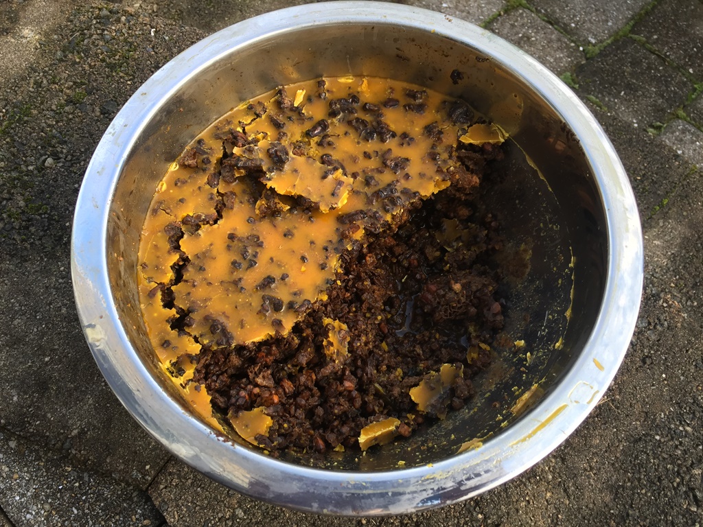 So I had a bowl of crud with some melted wax at the top, as shown in the picture. Not really what I had in mind, and I was surprised how little wax was actually present. I stored the wax pieces in a ziploc bag, and ordered some cheese cloth for my next attempt. Stay tuned.