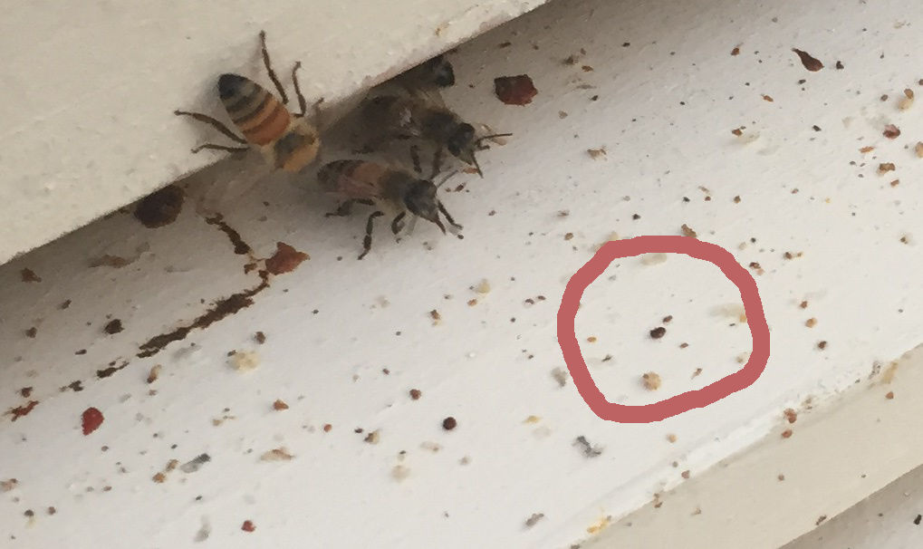 A week later, on April 28, I applied a second 25g treatment to both hives. The following morning I could see the dead mites in front of Ganymede. The hive has a solid bottom board, so the bees have to carry out any dead mites. I circled one in the picture here.