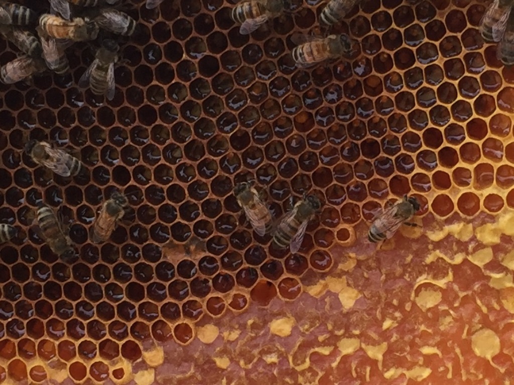 Nectar-filled cells in my top bar hive Saturn. I did feed this hive some syrup, but not very much. The bees have done well. (c) Erik Brown