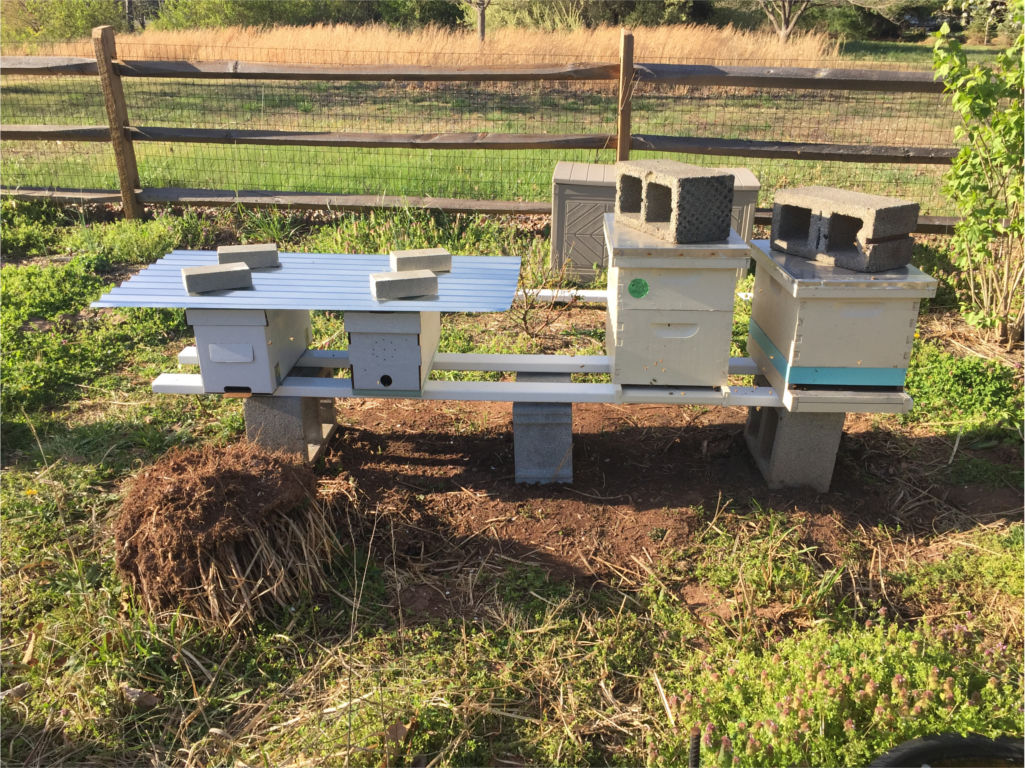 The new hives on April 9: New Nuc B, New Nuc A, Gany 2-3, and Gany 1. ©Erik Brown
