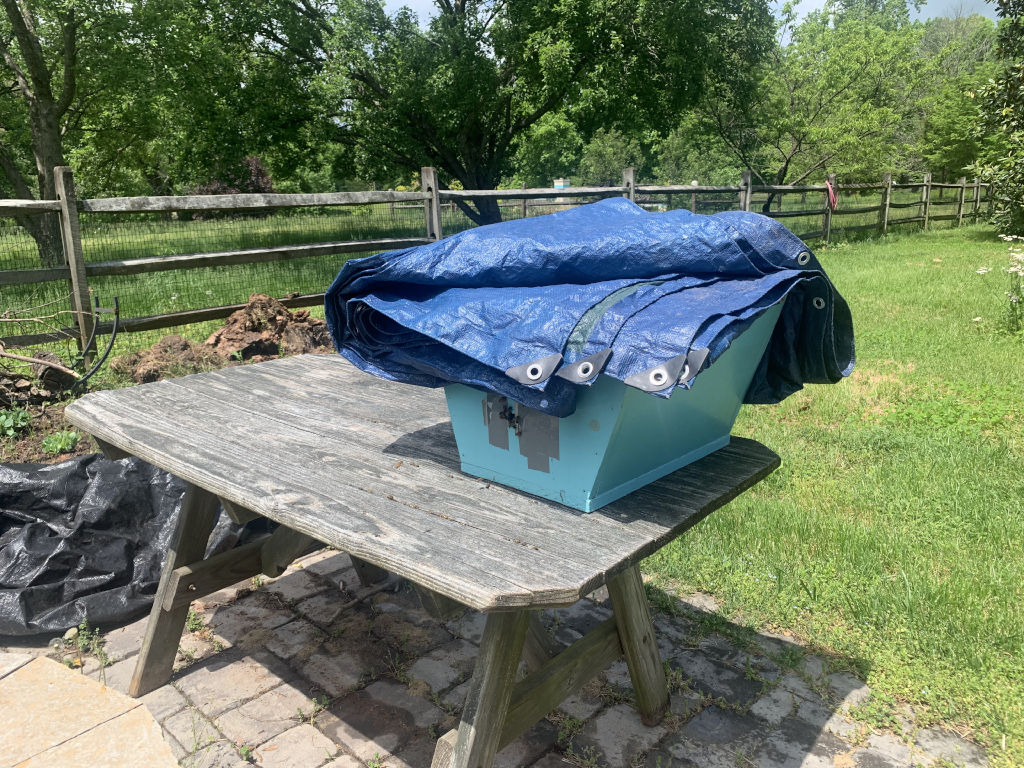 A swarm moved into this hive in early May, on the patio near our fire pit. It had 3-4 old combs, some of them a little moldy, but the bees didn’t seem to mind. This is May 4, 2019. The blue tarp served as a fine summer cover so I left it there. ©Erik Brown