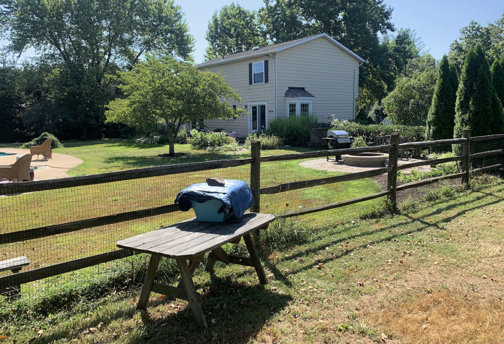 It wasn’t until August 11 that I was finally brave enough to move the hive beyond the fence, with the confused bees hovering until they figured out where to find their entrance. You can see the fire pit where it started in the background. ©Erik Brown