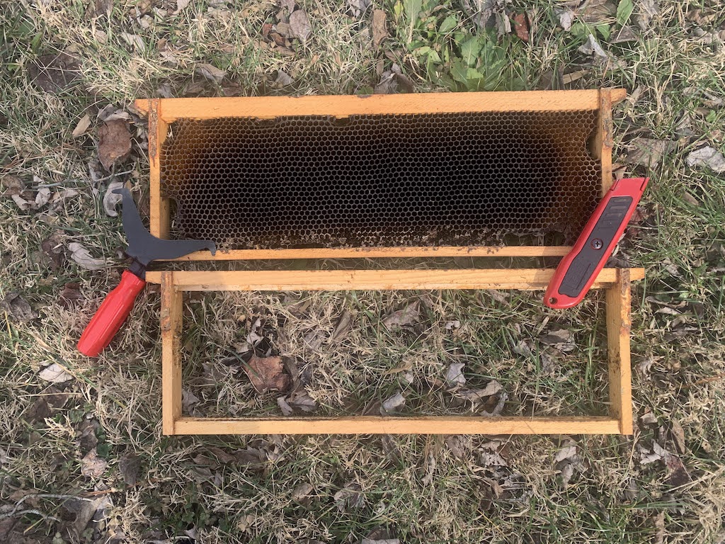 In the picture are some of the tools I’ve been using, in additional to a serrated knife and a hive tool. On the right is a standard box cutter. On the left is an automotive tool used to clean out the nooks and crannies. The suggestion for this tool was in a video from the beekeeper’s corner podcast, though I can’t seem to find this again right now. Wish me luck!