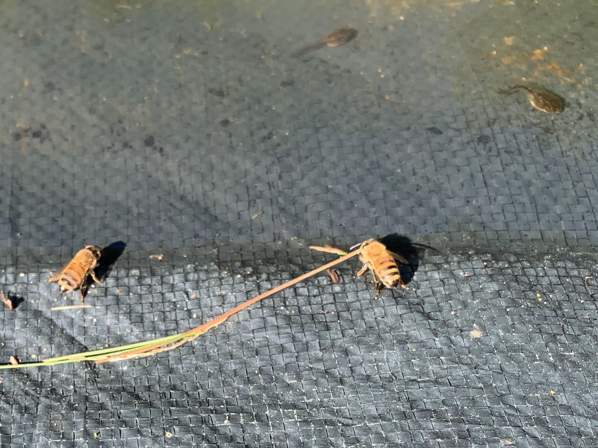 The below picture is a close-up of our pool cover. You can see the two bees drinking at the edge and two tadpoles swimming in the water. This water is really close to my hives and the bees enjoy it as long as it lasts.