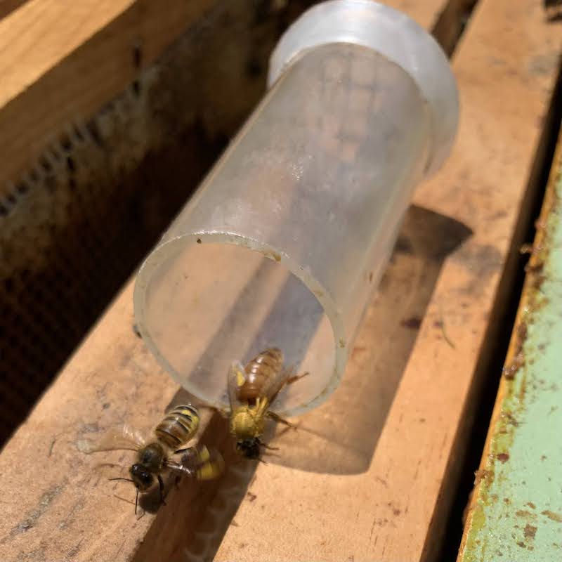 I use the tube shown in the below photo. Once inside, you can push her to the top with a soft plunger and press her lightly against the mesh (which she cannot fit through). A slight dab on the back with a yellow marker and you are done.