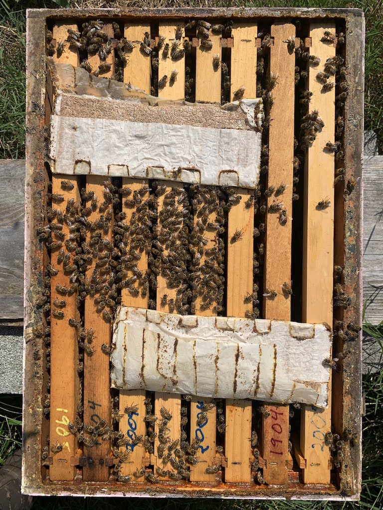 One of my nuc feeders sits on top of the hive with a floating platform for the bees, kind of like this one but smaller. The bees are a little annoyed when I open it up, probably because I am disturbing their home. They are pretty gentle, still, especially for late in the year.