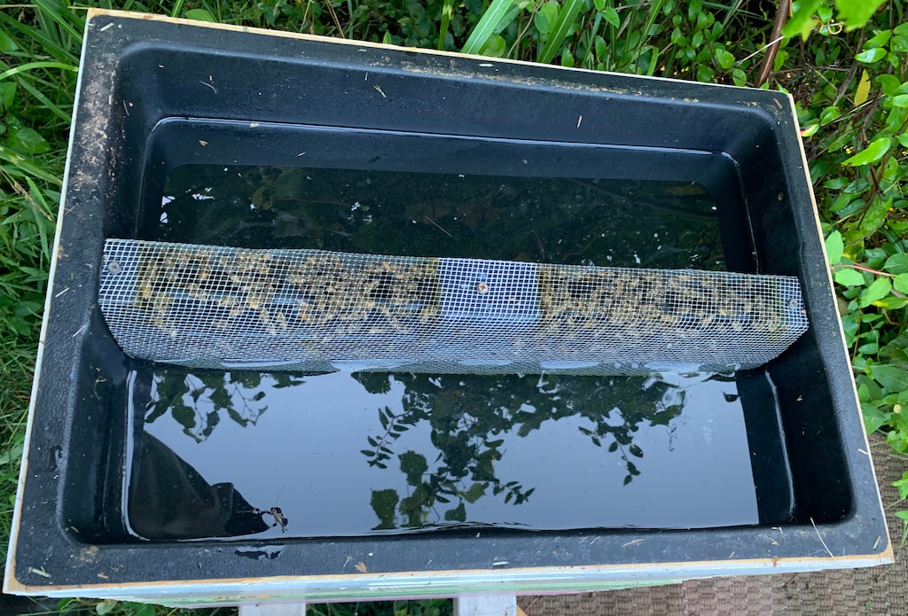 I prefer feeders like the one shown in the picture, where the bees are trapped in the hive and don’t fly around while adding additional syrup. The bees climb up through a hole in the middle, and then down the wire mesh to the waiting syrup. The box is actually level, even though it does not appear so in the picture.
