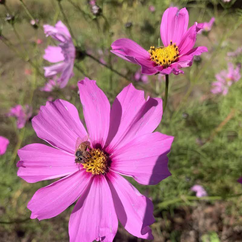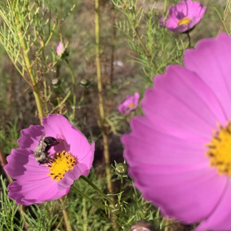 It may be fall, and may be cold (cool?) in Virginia, but the bees forage on. This week I was walking around the yard and found bees visiting the cosmos flowers that have bloomed recently. I planted some last year, and they self seeded to produce the flowers in this post. I was pleased to see a couple bees on them, probably looking for pollen. Cosmos is a good late-blooming flower. It is an annual though as you see here it can self-seed in future years.