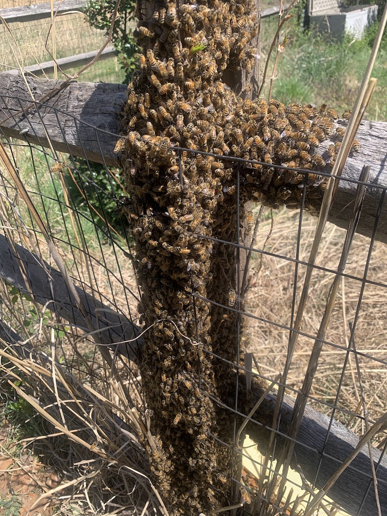 My hives had their first swarm of the year this week, on Tuesday, April 11. We’ve had 80 F temperatures this week, and I happened to be in the bee yard while it was happening, which is always fun. Bees flying everyone, gathering at the entrance, and making their way to wherever the queen decided to land. In this case, the bees landed on a nearby fence post.