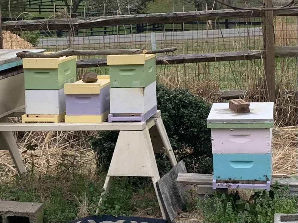 In the bee yard, I found a number of queen cells, and reduced the hive to two medium boxes, while making three new nucs. You can see the original hive (on the right) and the three nucs (on the left) in the below picture. I had a couple extra boxes and comb so I gave two of the nucs a little extra comb as some additional food and space to keep the queen cells warm.