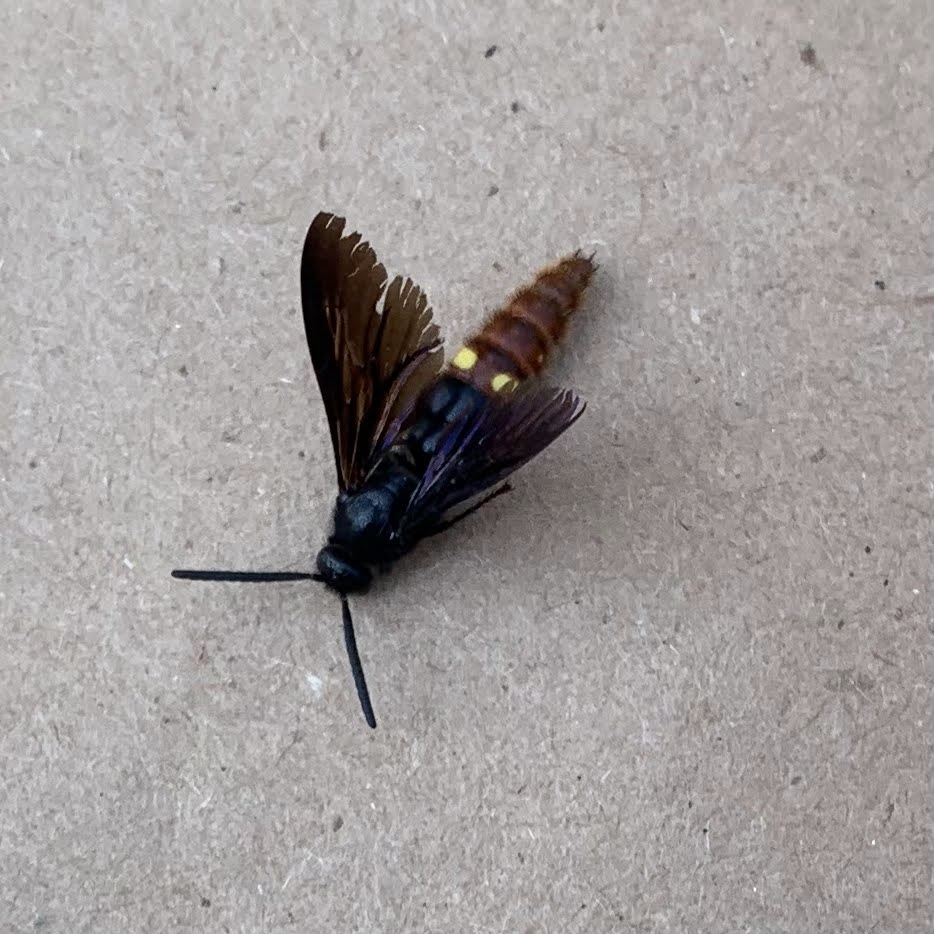 After learning this, I realized that we have indeed seen fewer Japanese beetles in our yard in recent years, so the wasps seem to have found a good food source. The species Scolia dubia has two subspecies. Based on BugGuide.net, Scolia dubia dubia has two yellow spots on its abdomen, while Scolia dubia haematodes does not. So my little friend must be the Scolia dubia dubia, or two-spotted scoliid wasp. A lot of sites seem to refer to these as “blue-winged wasps,” which is apparently not the case. So I’m glad we could clear this up, and good to know these are beneficial. I think we’ll leave them to they lazy circles around the lawn.