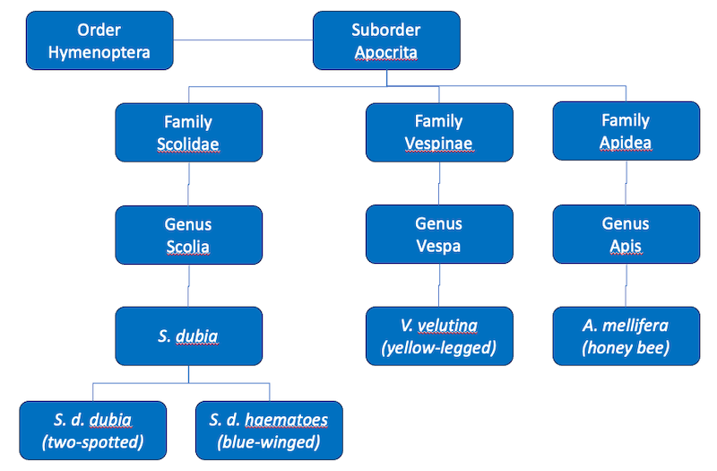 I also learned that the Order Hymenoptera we discussed last time has a couple Suborders, including the Suborder Apocrita which includes most wasps, bees, and ants. The Family Scolidae includes scoliid wasps, or digger wasps, that tend to be black in color, with the females laying eggs in larva. The females stings the larva to paralyze it, and then lays an egg inside which emerges to consume the still-alive larva. They are generally beneficial parasites which keep down populations of beetles, including Japanese beetles.