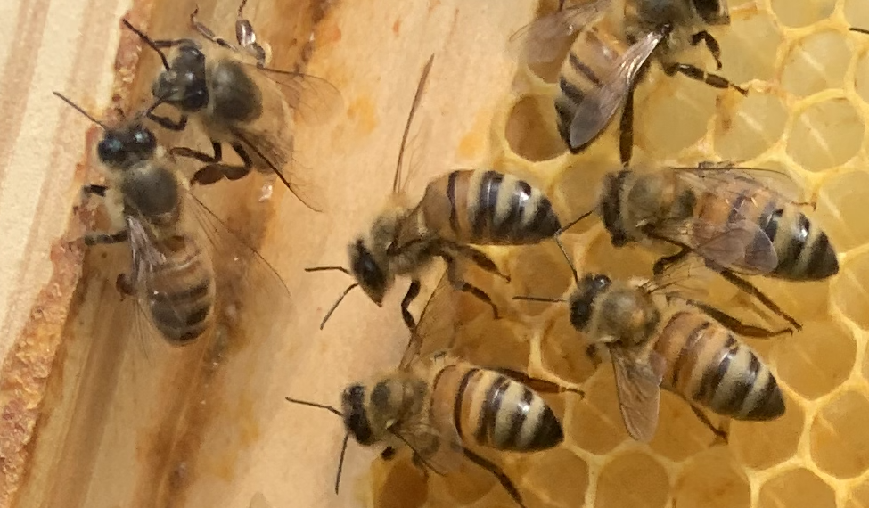 Honey bee works use their antennae throughout the hive to sense vibrations, resources, and other aspects of the dark interior. In the following image you can see the pedicel of some bees where the antenna bends near the head.