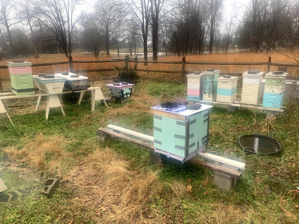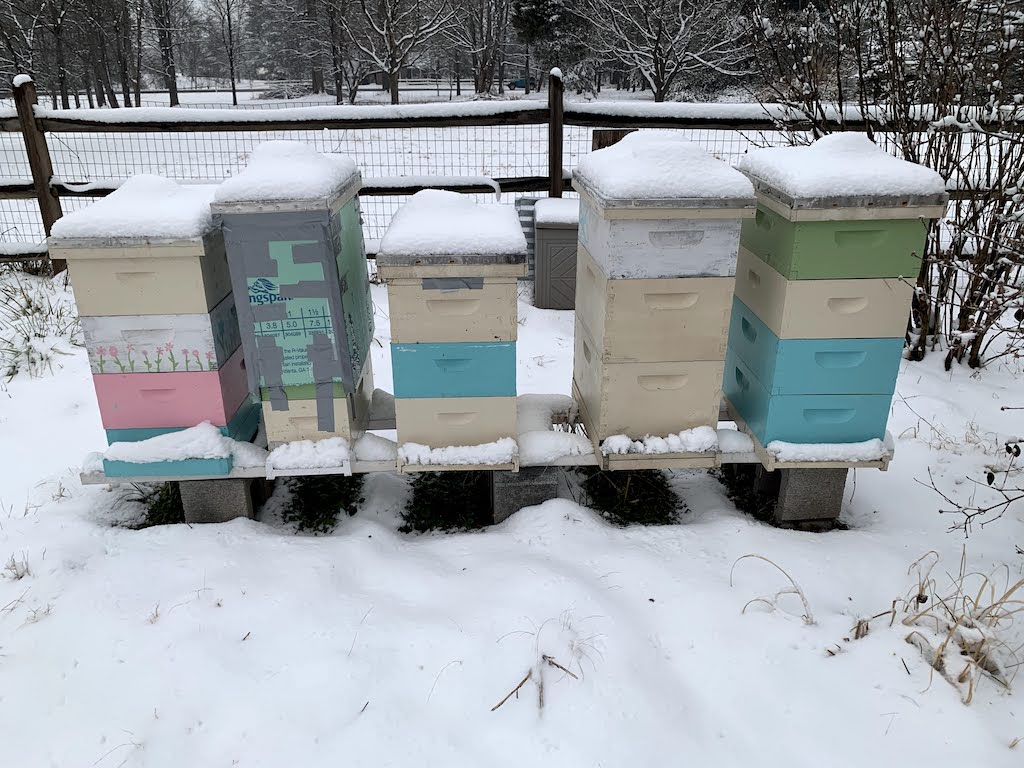 Langstroth hives on January 31, 2021: Pandora, Io, Calypso, Mars2, and Mercury. ©Erik Brown